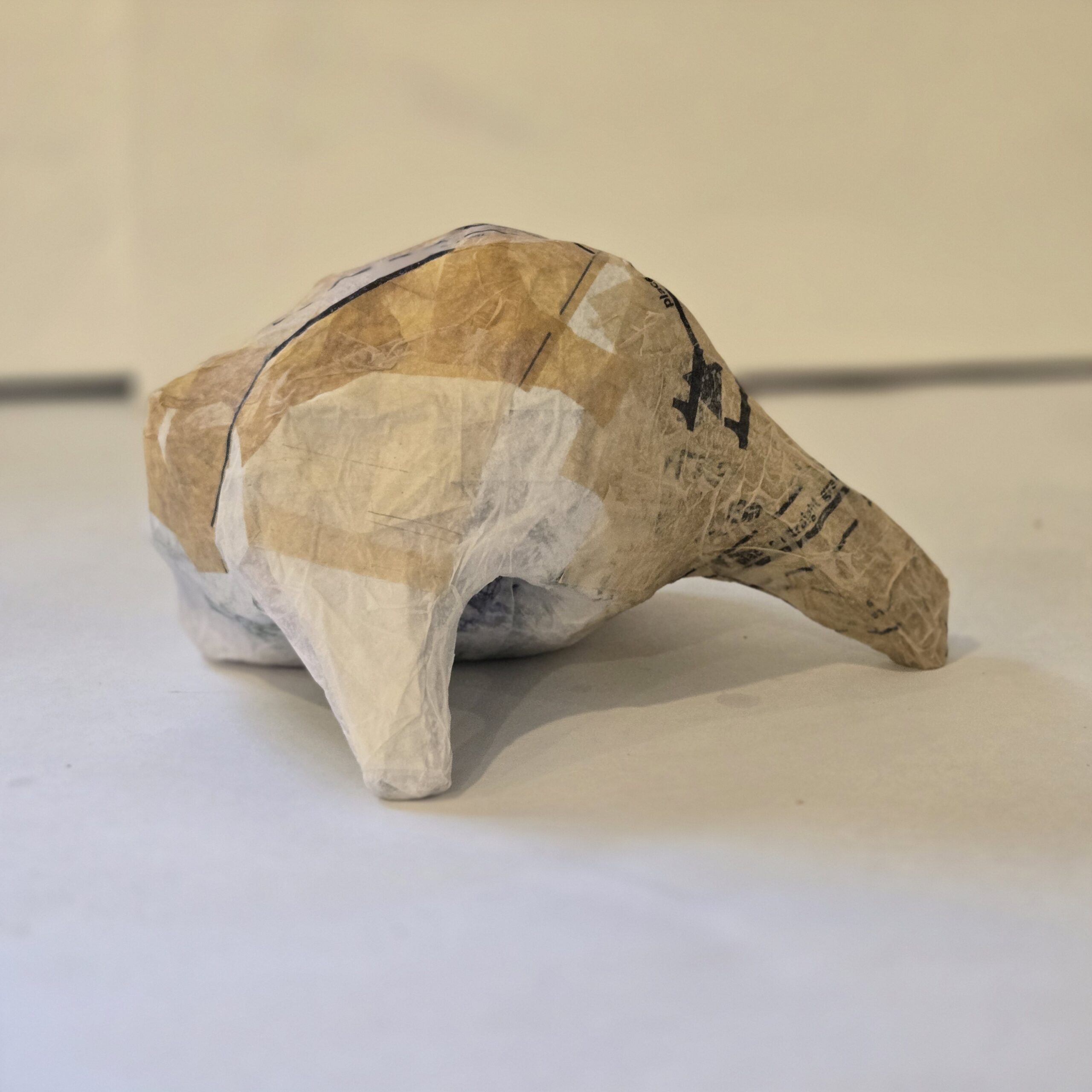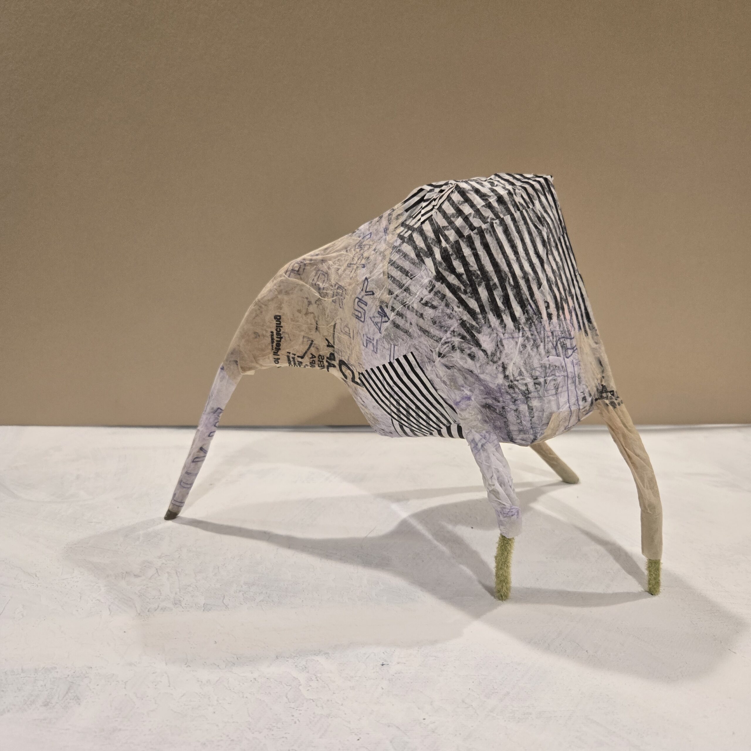 Her work draws from thrift store finds, repurposed packaging, and the detritus of single-use plastics, cardboards, and paper. Her art lives with constituent objects designed to be discarded. Annie subverts this brief existence, giving them new bodies that often resemble mammals taking first steps, orienting themselves toward a fragile new life.